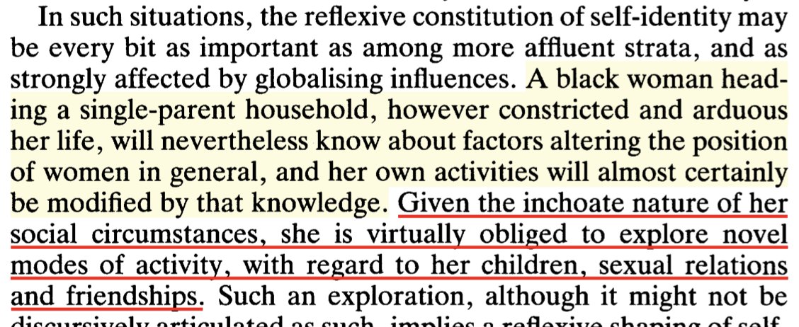 I found Giddens’ work uninspiring. I find work on late modernity from White men uninspiring (perhaps I’ll write a short positionality statement to absolve myself from explaining why 🙃). Giddens 1, whose work covers late modernity and its impact on identity, intimacy, and relationships with the State, also wrote about how people with different identity categories will have varying experiences with all of the above (so an intersectional consideration). However, he also finds it befitting to speak with such violent authority on Black womanhood, perpetuating stereotypes and flattening Black women’s lives in an essentialist doctrine.